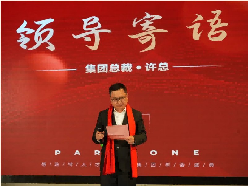 会议伊始,集团总裁许总登台致辞,感谢格瑞特全体同仁的努力和付出,并向大家致以新年的美好祝愿。