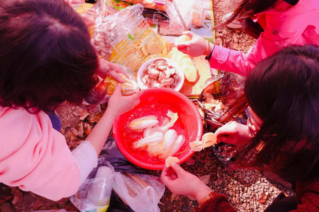 撘砖头,捡柴火,下面的火噼里啪啦的烧,上面的油滋啦滋啦的冒泡,这一把火将小伙们的心情完全点燃。
