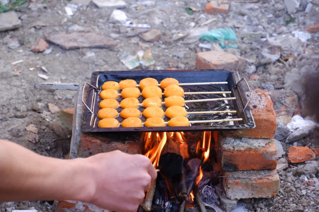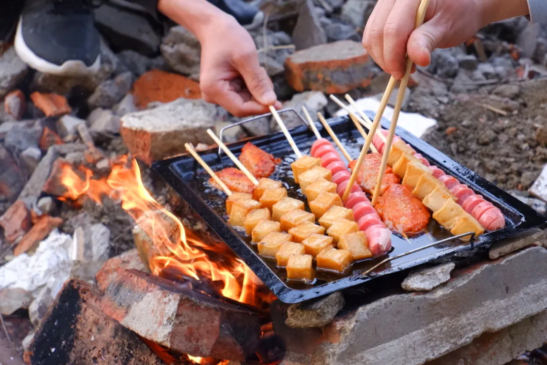 当新鲜出炉的烤肉被一抢而光,大家又急中生智,建土灶,开油炸,与烧烤炉并肩产粮。